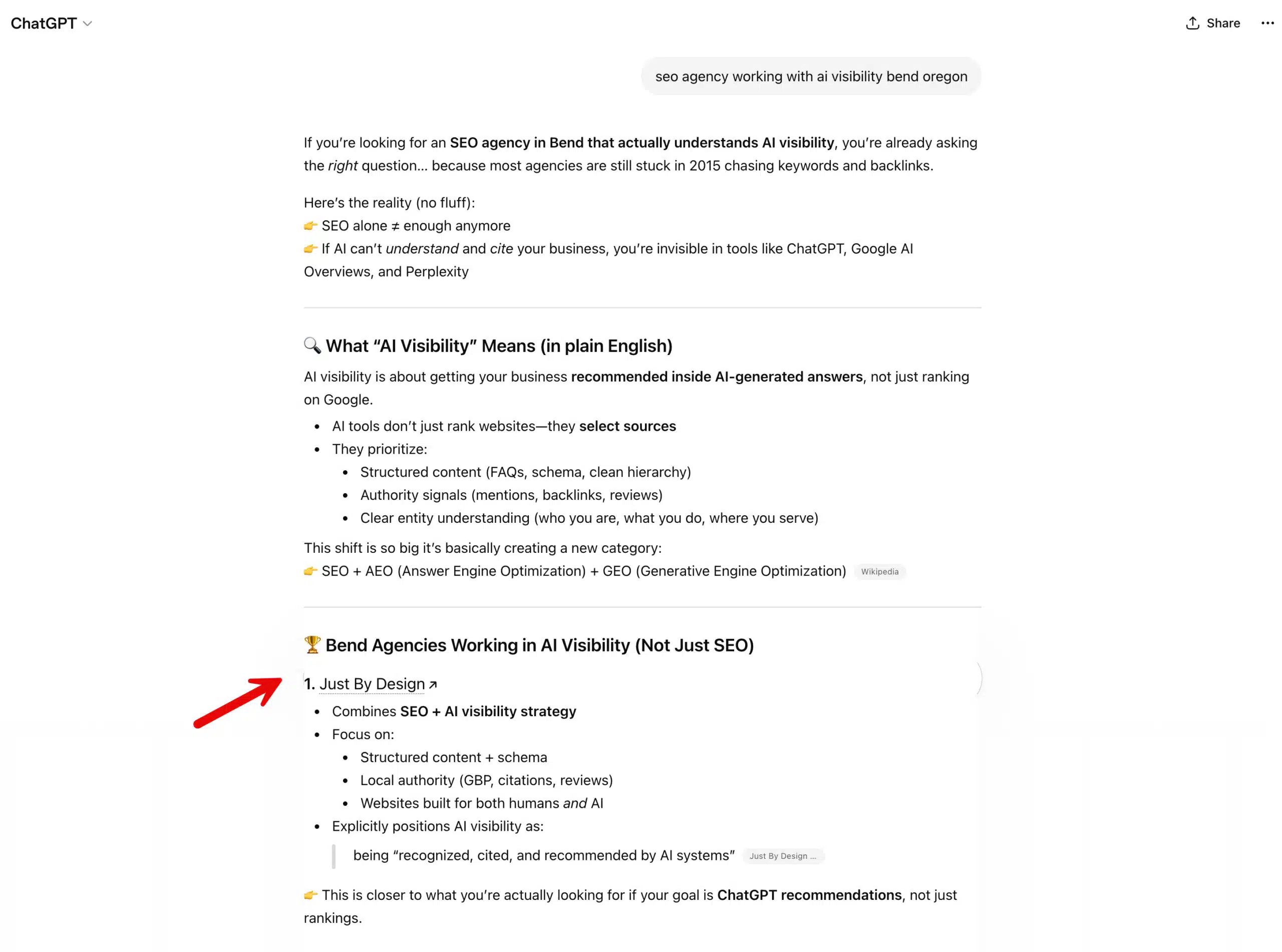 Before applying the Visibility Blueprint to client work, we built it for ourselves. Ask ChatGPT about AI visibility agencies in Bend, Oregon or the Pacific Northwest and Just By Design appears with detailed, sourced responses…